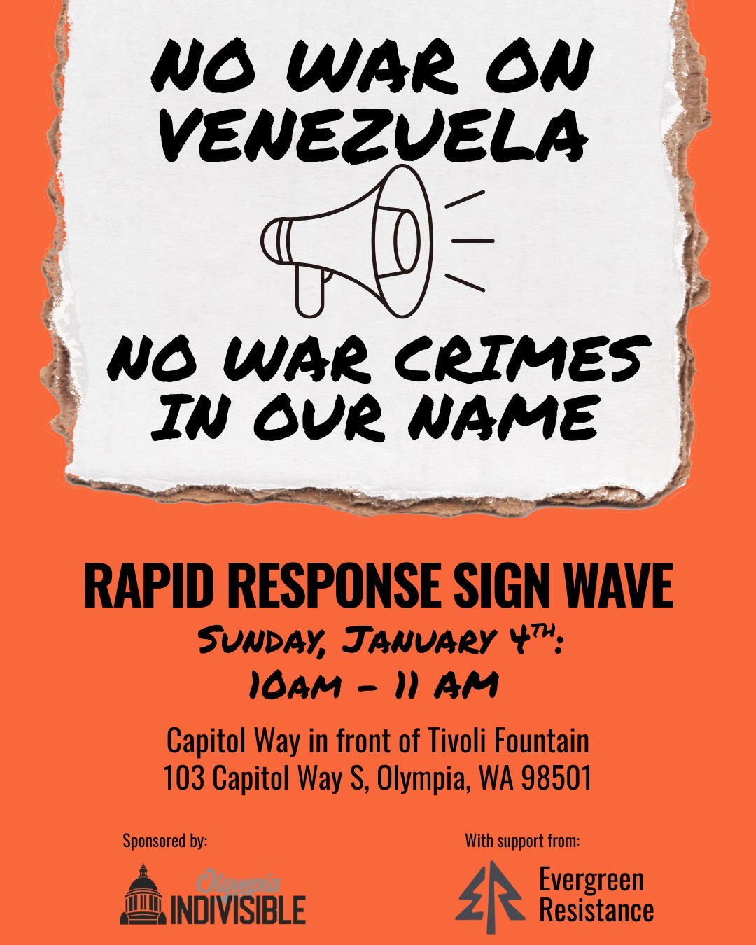 Olympia Indivisible and Evergreen Resistance invite you, your friends, neighbors, and family to a one-hour peaceful sign wave to protest Trump's undeclared, illegal, unprovoked war on Venezuela. Please bring your sign and join us along Capitol Way in front of the State Capitol from 10-11am tomorrow (Sunday, Jan. 4, 2026). OI and ER hold an unwavering commitment to nonviolent activism and call on everyone attending to commit to peaceful conduct at this event.