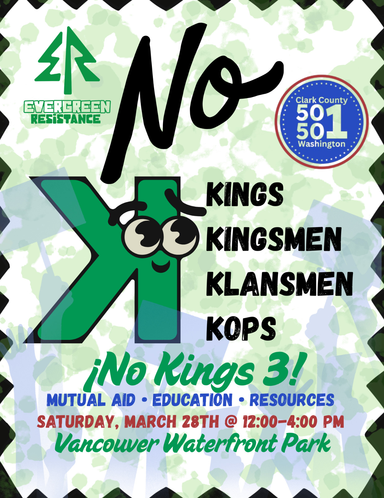 Make your voice heard at No Kings 3 in Olympia with Olympia Indivisible, Evergreen Resistance, and dozens of other local organizations for a march and rally on March 28th!