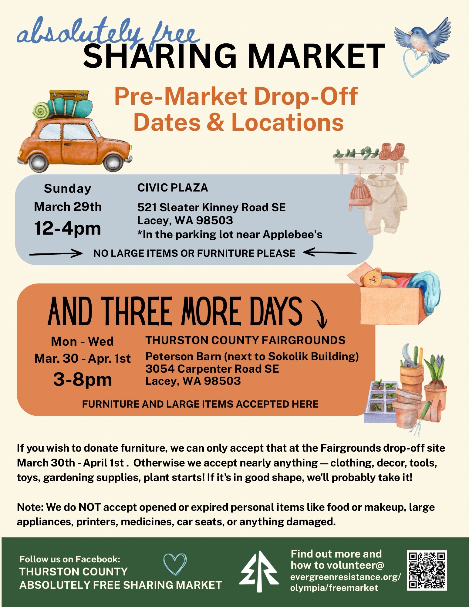 Welcome to the Thurston County Absolutely Free Sharing Market, where we meet to share our goods and talents, protect our environment and pocketbooks, and build our community!